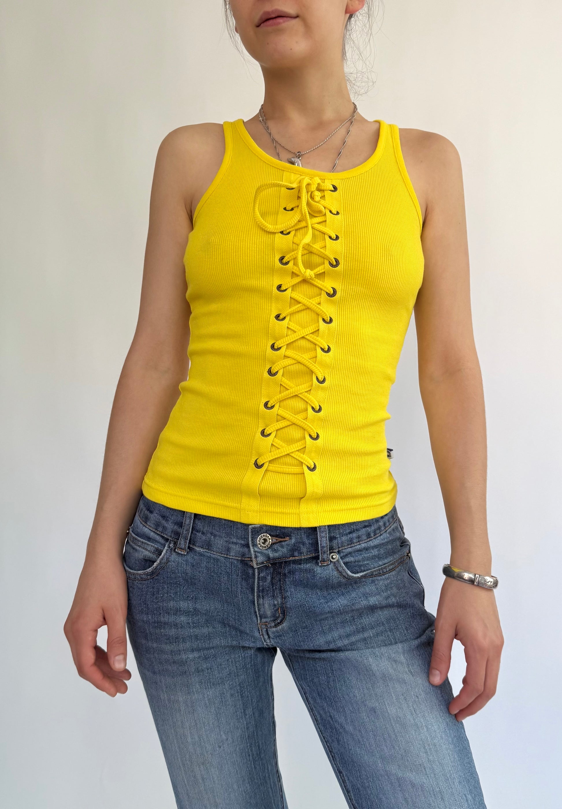 Y2K DEADSTOCK by AKADEMIKS Yellow lace up tank top